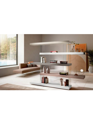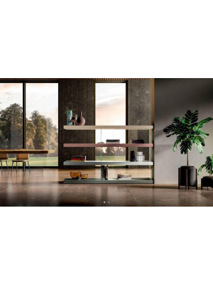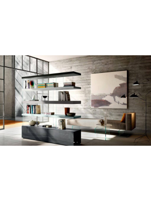 El sistema AIR se basa en estantes y módulos suspendidos sobre patas de cristal casi imperceptibles. Esta solución estructural crea un efecto visual único: las librerías parecen flotar en el aire, eliminando el peso visual y permitiendo que la luz circule libremente.