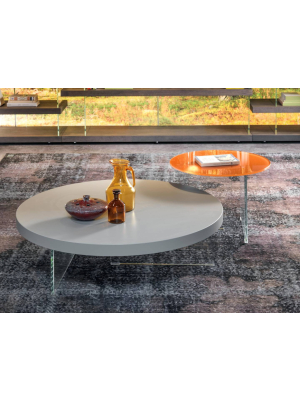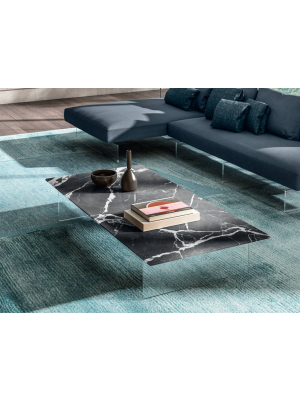 Las mesas de centro LAGO se caracterizan por su diseño suspendido o apoyado sobre estructuras de cristal templado, lo que les confiere una ligereza visual única. Esta estética flotante potencia la luminosidad del espacio y crea una sensación de orden y fluidez en la estancia.